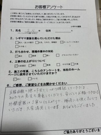 お客様アンケートにご記入いただきました|八女市で外壁塗装はシギヤマ塗装